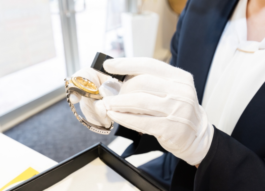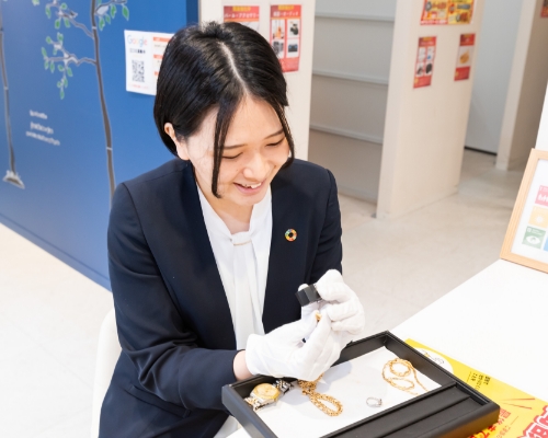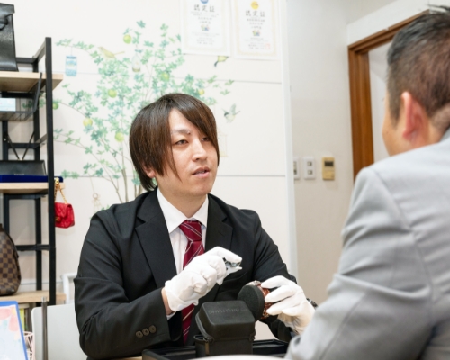 ご来店されたお客様からブランド品・時計・貴金属・ジュエリー・切手・古銭・骨董品などをお預かりし、 お品物の状態確認、査定、買取価格のご案内を行います。